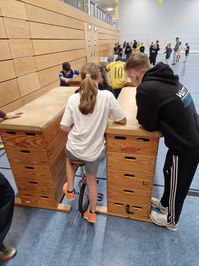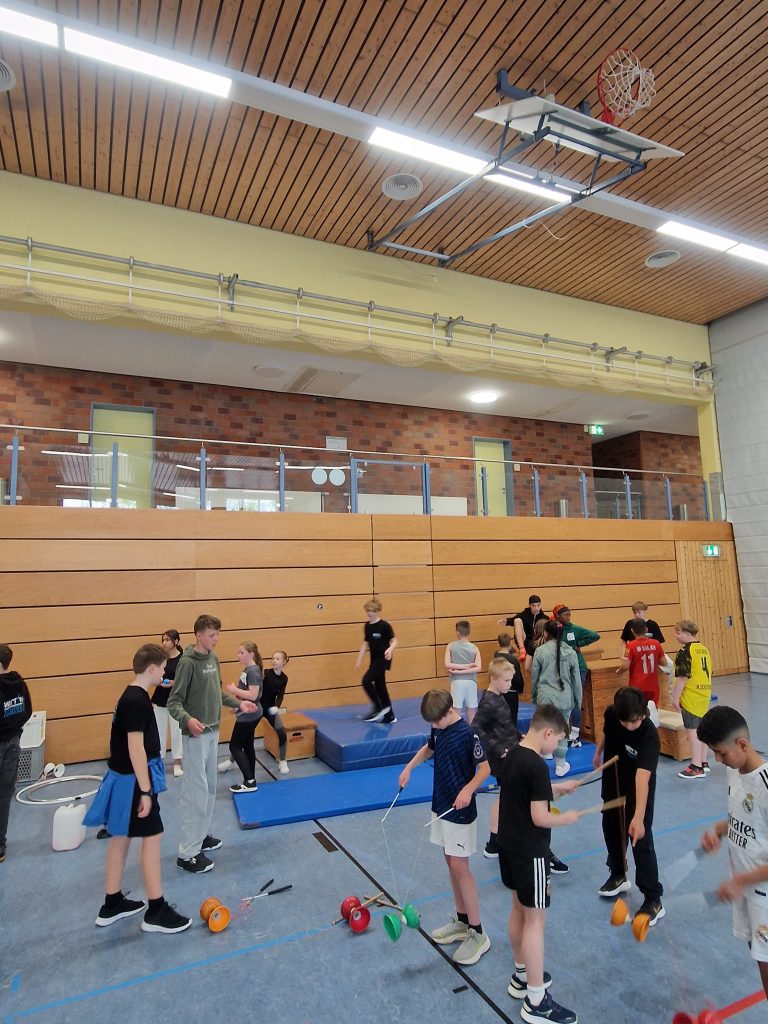 Unsere Artistinnen und Artisten zeigten unterschiedliche Zirkusdisziplinen und gaben ihr Wissen mit viel Freude weiter. Dabei wagten sich die Grundschüler und -schülerinnen an viele neue Übungen heran und konnten an diesem besonderen Tag über sich hinauswachsen.