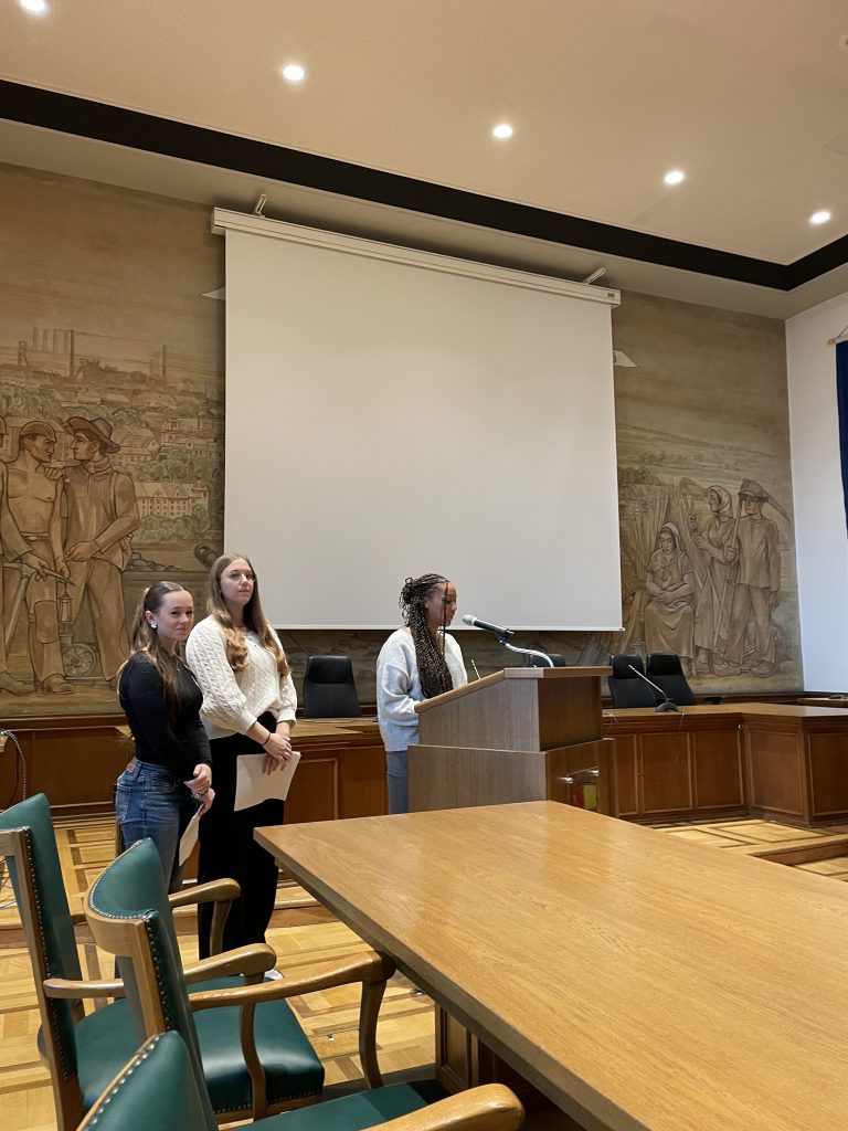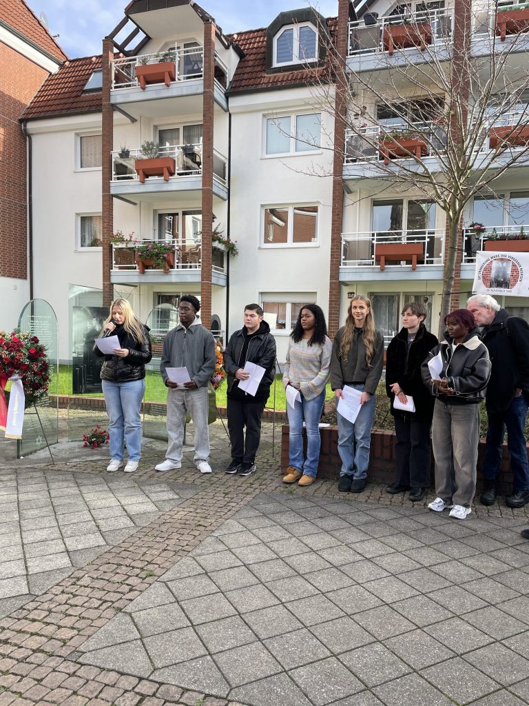 Dabei präsentierten Chantel Huppert, Miriam Schanze und Selina Timpen aus dem Projektkurs Stolpersteine im Wattenscheider Rathaus einen Beitrag zur über 400-jährigen Geschichte der jüdischen Menschen in Wattenscheid. Die Schülerinnen und Schüler des evangelischen Religionskurses der Q2 trugen anschließend an den Stelen auf dem Nivellesplatz eigens geschriebene Texte und Gedichte zu den Themen Freiheit und Verantwortung vor dem Hintergrund der Verfolgung der Juden zur Zeit des Nationalsozialismus. Organisiert wurde die Veranstaltung von der Bezirksvertretung Wattenscheid und dem Verein Stelen der Erinnerung.