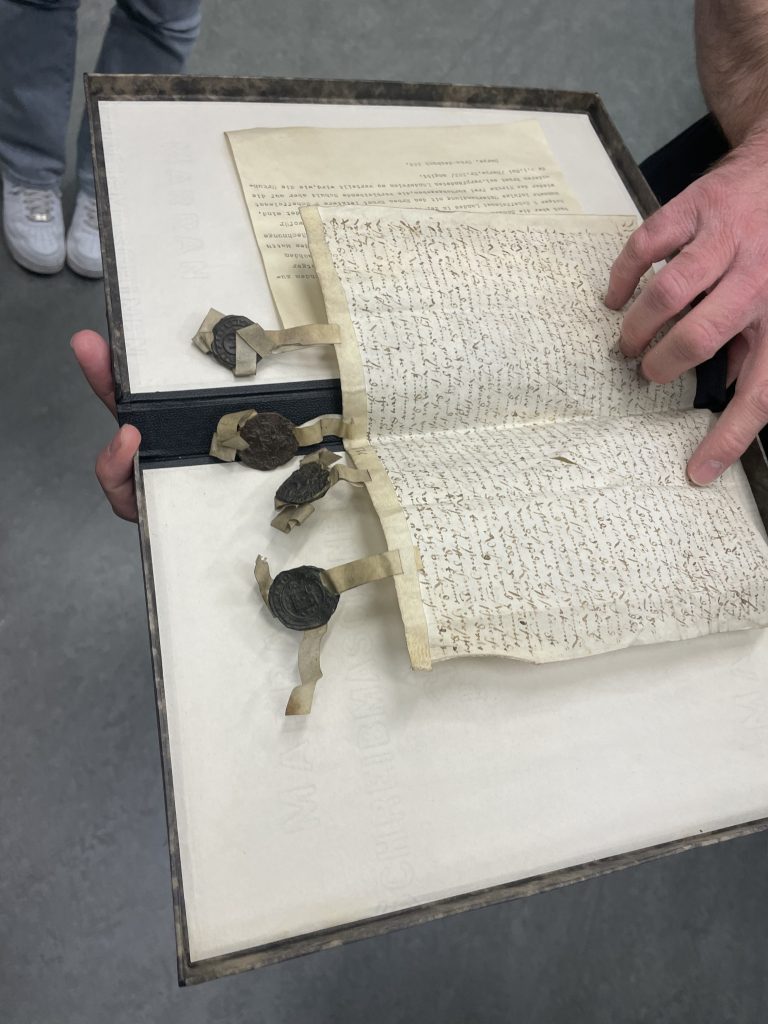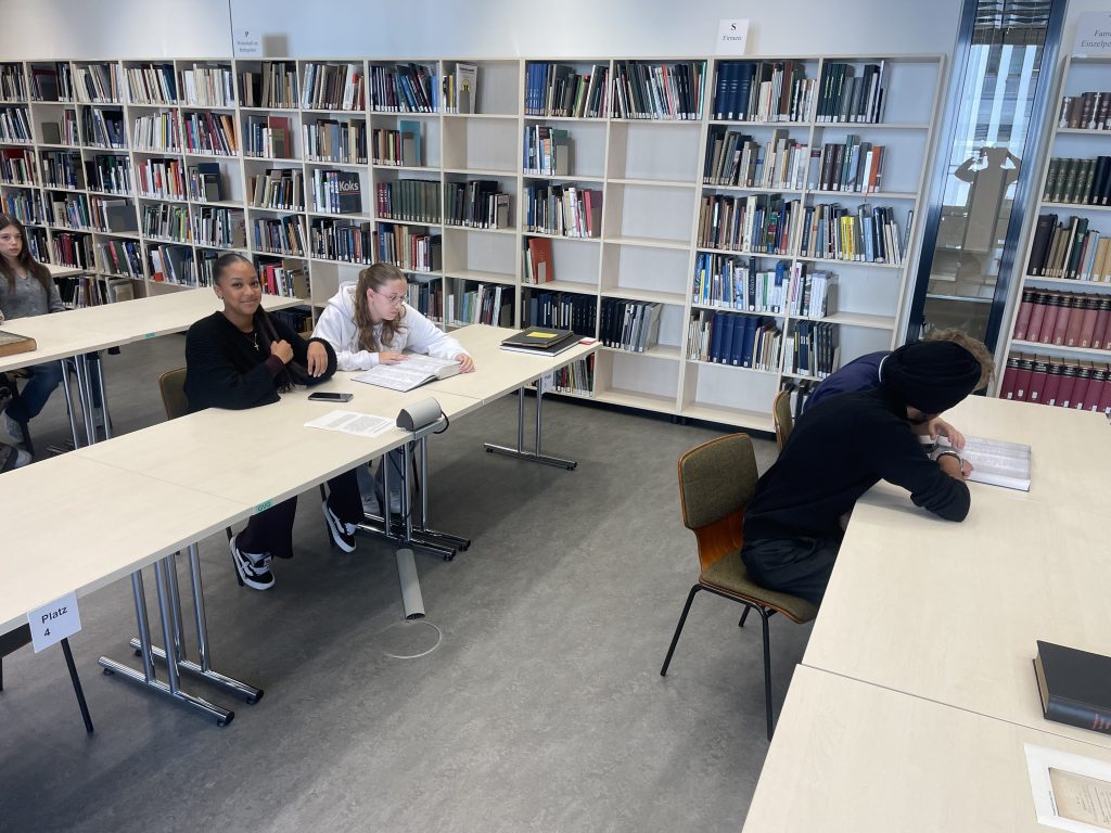 Zum Auftakt der diesjährigen Projektkursrecherche besuchten die Schülerinnen und Schüler das Stadtarchiv Bochum. Dabei erhielten sie einen Einblick in die Arbeit eines Archivs und die Bestände im Stadtarchiv. Hierbei durfte unter anderem eine Urkunde aus dem Jahre 1566 begutachtet werden. Außerdem begannen die Schülerinnen und Schüler damit, die ersten Unterlagen zur jüdischen Familie Kempinski zu sichten, welche während der Zeit des Nationalsozialismus aus Bochum entkommen konnte und in die USA flüchtete. Zum Abschluss gingen alle noch gemeinsam durch die Dauerausstellung zur Stadtgeschichte Bochums und Wattenscheids.